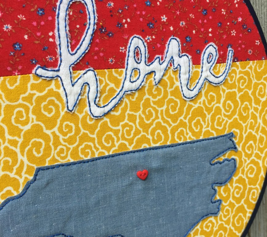 I’ve been working on this embroidery piece as a gift. The fabric pieces are remnants from the Scrap Exchange, a local reseller of donated craft materials and industrial discards. I never know what I will find there! Combining the state shape with “home” and a heart for our city isn’t the most original concept, but I haven’t seen anything quite like this design in shops or … Continue reading Home state hoop art